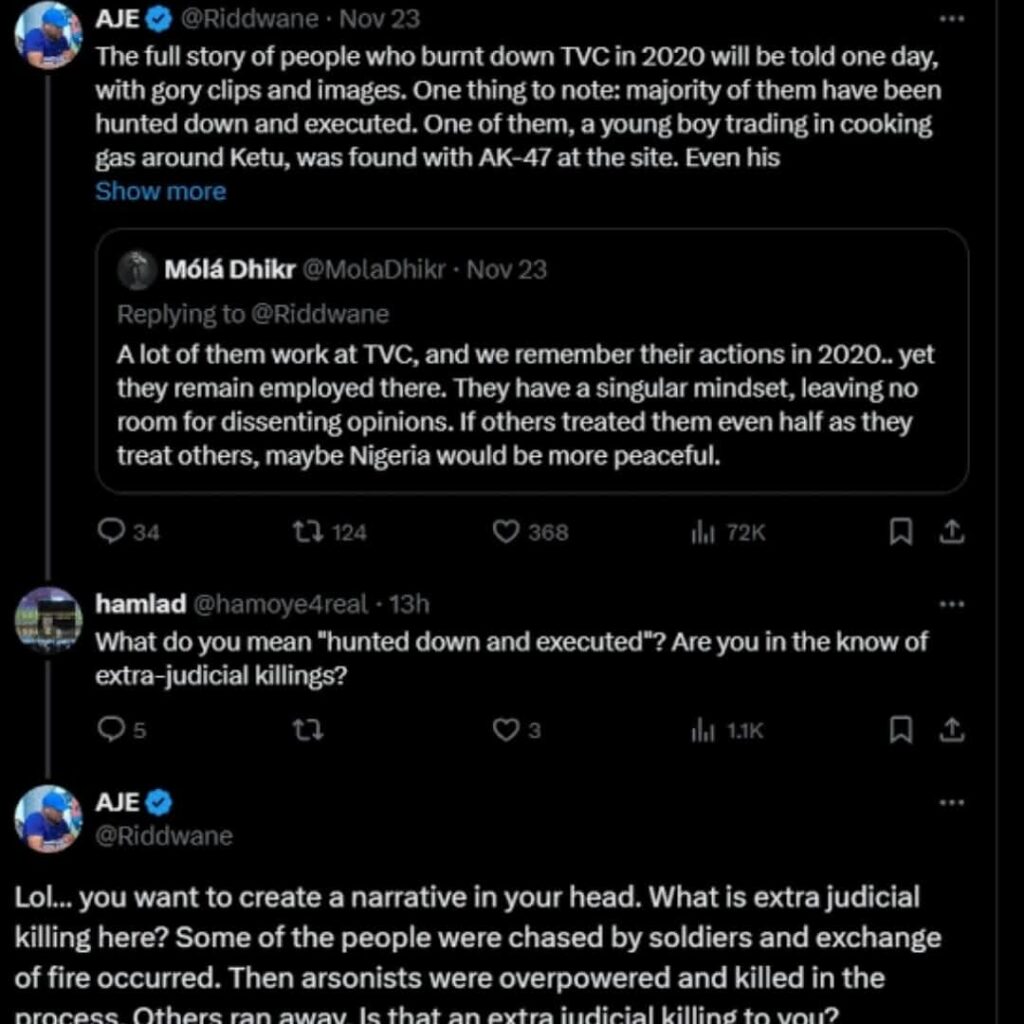 Ajetunmobi took to X days ago to claim that some arsonists who torched the Television Continental (TVC) head office in Lagos during the #EndSARS protest in 2020 were “hunted and executed.”