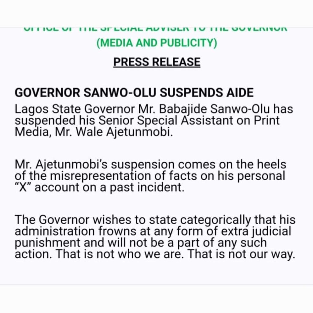 Lagos State Governor, Babajide Sanwo-Olu, has suspended his Senior Special Assistant on Print Media, Wale Ajetunmobi over a tweet he made.